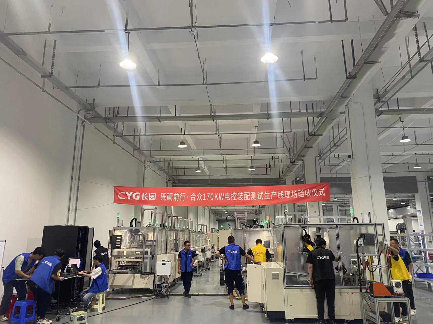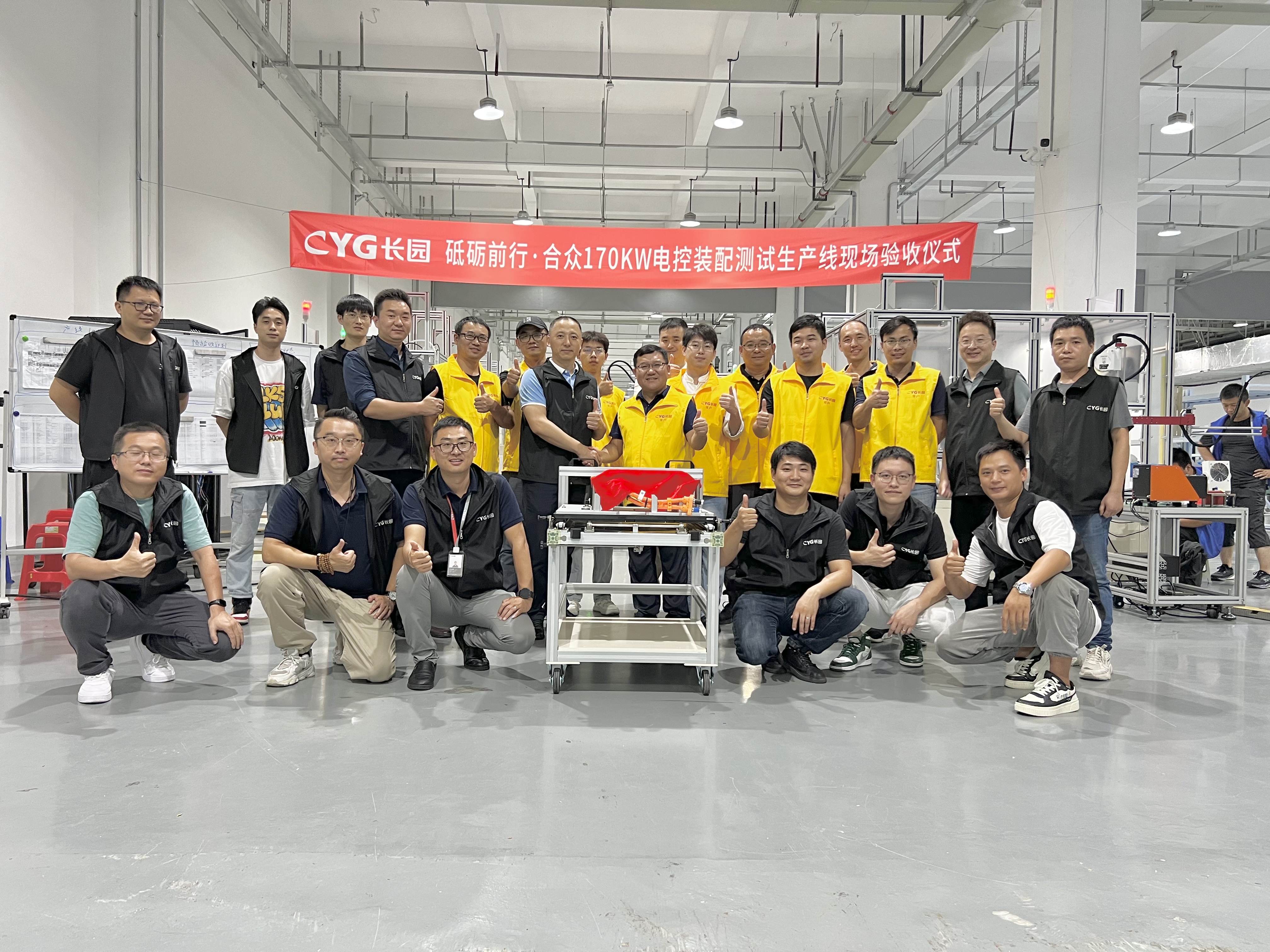验收会议上,达明科技项目负责人首先介绍了产线的核心工艺及关键技术,整线包含清洁、锁付、点胶、IGBT压接和在线老化测试、EOL测试等工艺;随后,合众现场生产负责人指挥试产,成功生产装配并测试完成了20台电控产品,实现了产线的功能设计验证。整条产线仅耗时三个月就设计交付,是公司标准化平台的重要技术成果。会上,刘总对达明科技的研发、制造及交付能力给予了充分的肯定。
